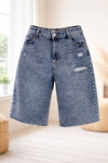 Bermuda en denim azul con acabado desgastado y detalles sutiles que le dan un estilo moderno y casual. Su diseño cómodo y versátil es ideal para el día a día, tiro medio, bolsillos funcionales, cierre con botón y cremallera, acabado desgastado, corte cómodo.