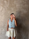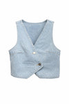 Chaleco en denim azul claro con diseño moderno y corte corto que aporta un estilo fresco y versátil. Su escote en V y cierre frontal con botones lo convierten en una prenda ideal para combinar con camisetas, blusas o vestidos y crear looks casuales y urbanos.
