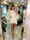 Vestido corto blanco con encaje y volantes, de estilo romántico y elegante, ideal para ocasiones especiales.