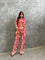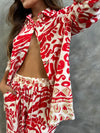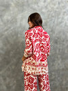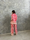 Conjunto estampado en rojo y blanco con diseño floral, compuesto por camisa de manga larga y pantalón amplio, ideal para un look fresco, moderno y lleno de estilo.