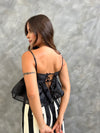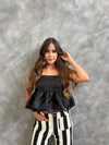 Top tipo peplum con un diseño romántico y sutil. Tirantes finos, que aportan un aire delicado y veraniego. Corte ajustado en la parte superior y con vuelo en la parte baja, que genera un efecto acampanado muy favorecedor.