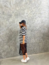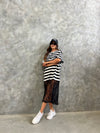 Vestido urbano en estilo oversize, con diseño a rayas y falda de encaje transparente. Un look moderno y atrevido, ideal para outfits casuales con un toque edgy.