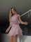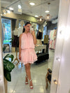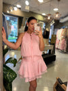 Vestido corto rosa con acabado satinado, diseño fluido y falda con volantes que aportan movimiento y frescura.
