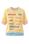 Buzo tejido de textura suave y acabado tipo peluche, su diseño destaca por sus bordados de saludos en diferentes idiomas, combinados con colores vibrantes que transmiten frescura y estilo, las lentejuelas aportan un brillo sutil que lo hace perfecto tanto para el día como para ocasiones especiales.