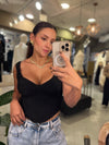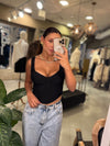 Corset negro en encaje con varillas estructuradas y escote delicado, ideal para realzar la figura con un toque elegante y sensual.