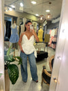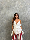 Blusa tipo corset con escote profundo en forma de corazón y detalle de lazo frontal, ideal para un look elegante y sofisticado.